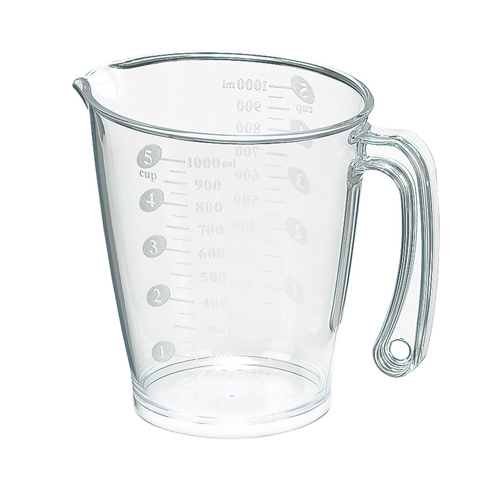 可量測至 1000毫升 的量杯。前後兩側皆附有刻度。附有握把與注嘴,方便傾倒。